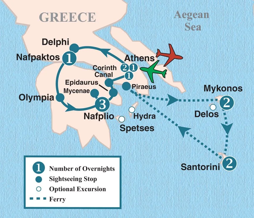before exploring the picturesque mainland, dotted with charming villages and lush olive groves. Sail to the sun-kissed islands of Mykonos, with its iconic windmills and lively atmosphere, and Santorini, where white-washed buildings cling to dramatic cliffs overlooking a sapphire sea. Each day in Greece offers a new delight, from savoring fresh seafood by the Aegean to dancing under the stars in a traditional taverna, ensuring memories that will last a lifetime. Highest Elevation: 2073 feet above sea level in Delphi. Walking Expectations: “Active” - An average of 3 1/2 miles per day often encountering uneven surfaces, steps and inclines.